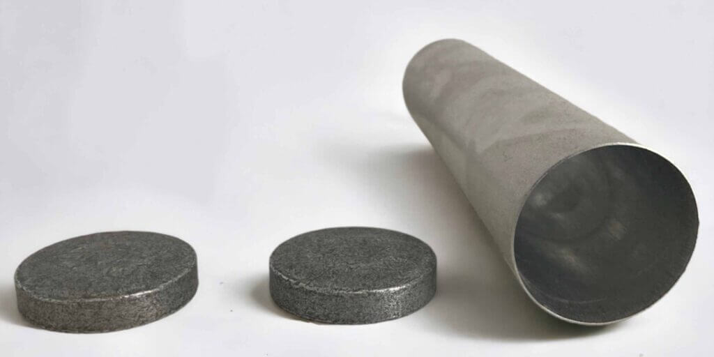 Production begins with a small disc of aluminium called a slug, made from a mix of virgin and recycled aluminium. This blank will be cold-formed into a bottle.