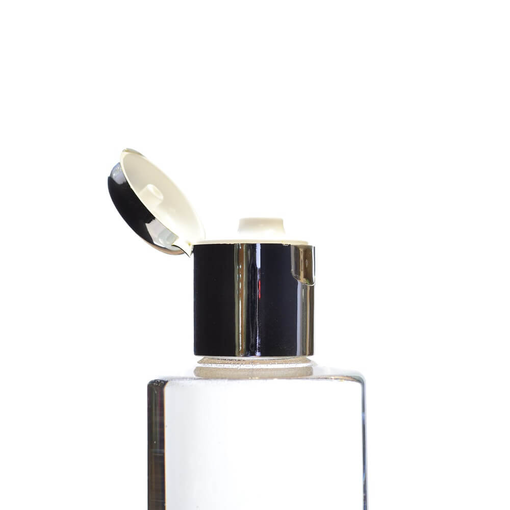 This flip top cap is suitable for bottles with an 24/415 neck. It has a stand-out look with the glossy silver metalised effect. This flip top cap that can be used across a range of product applications in personal care, home care, health care products. It’s an ideal choice for products that you don’t want to fully remove the cap from. Suitable for a range of liquid products.