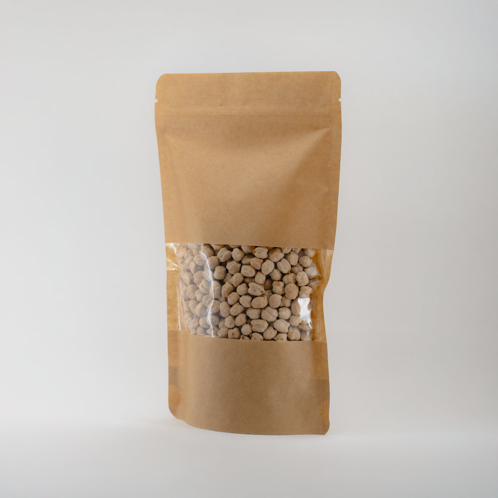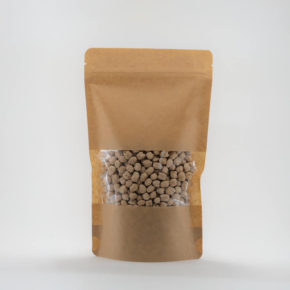 The 500g Brown Kraft Stand-up Pouch with Window is a packaging solution that offers both visibility and protection for your products. The clear window panel allows customers to see the contents, enhancing product appeal, while the resealable grip seal and high-barrier PET layer protect against moisture, oxygen, and contaminants, ensuring longer shelf life and freshness.