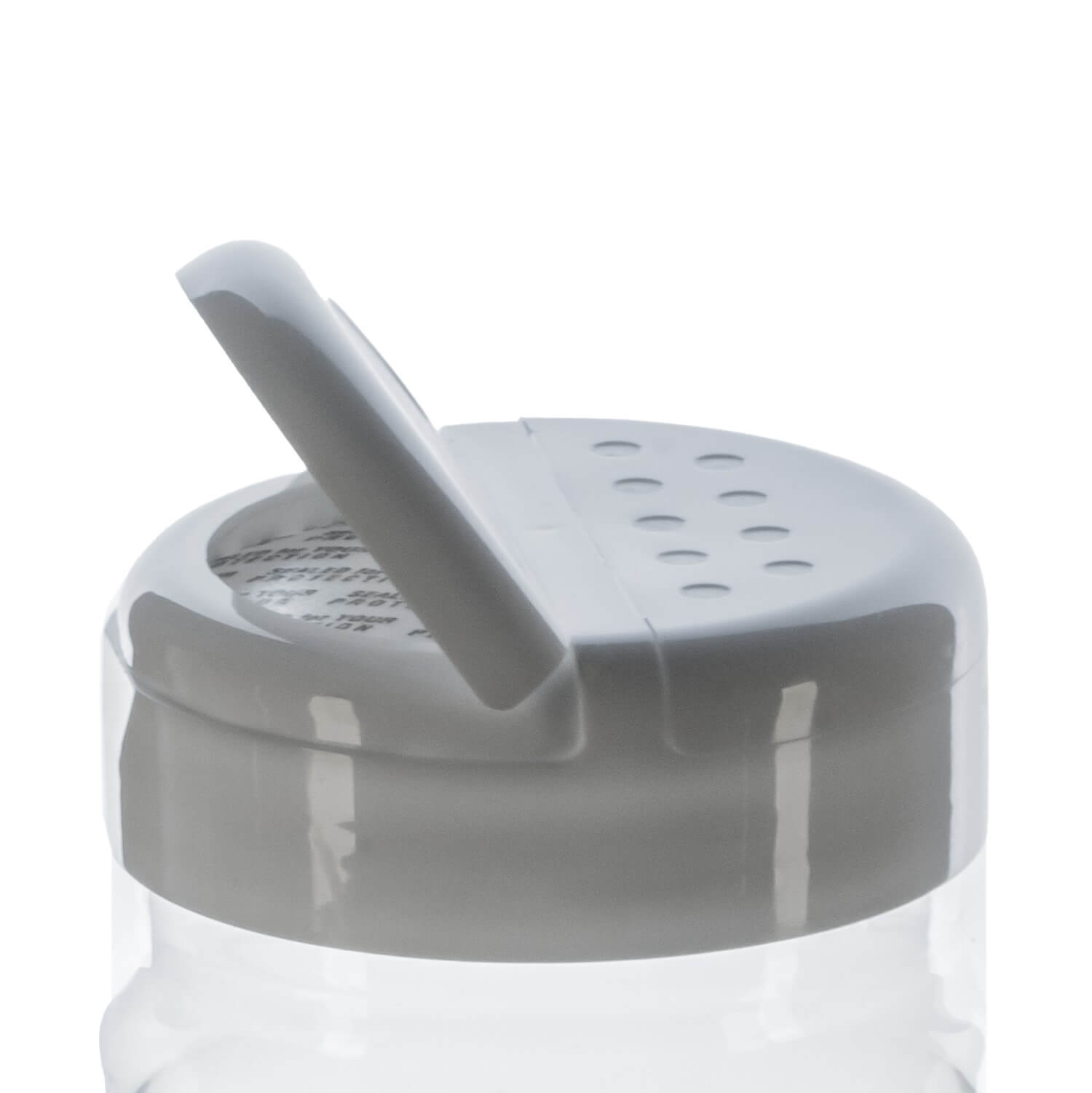 – Design: Flapper-style cap for controlled dispensing of powdery and granular products
